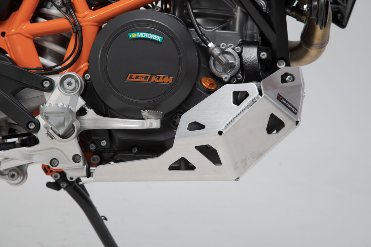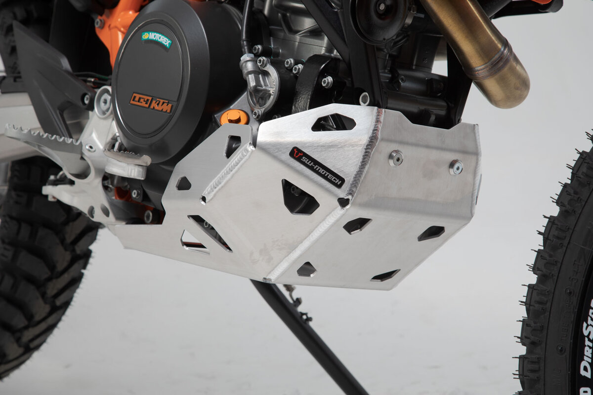 Constructed of 3 mm thick brushed aluminum plate, protecting the underbody of your bike from stone chippng and collision. The whole pattern ensures good ventilation of the engine block. Vibration is reduced by use of rubber mounts.