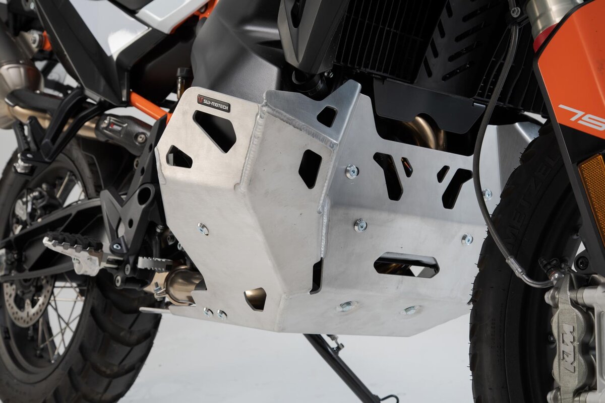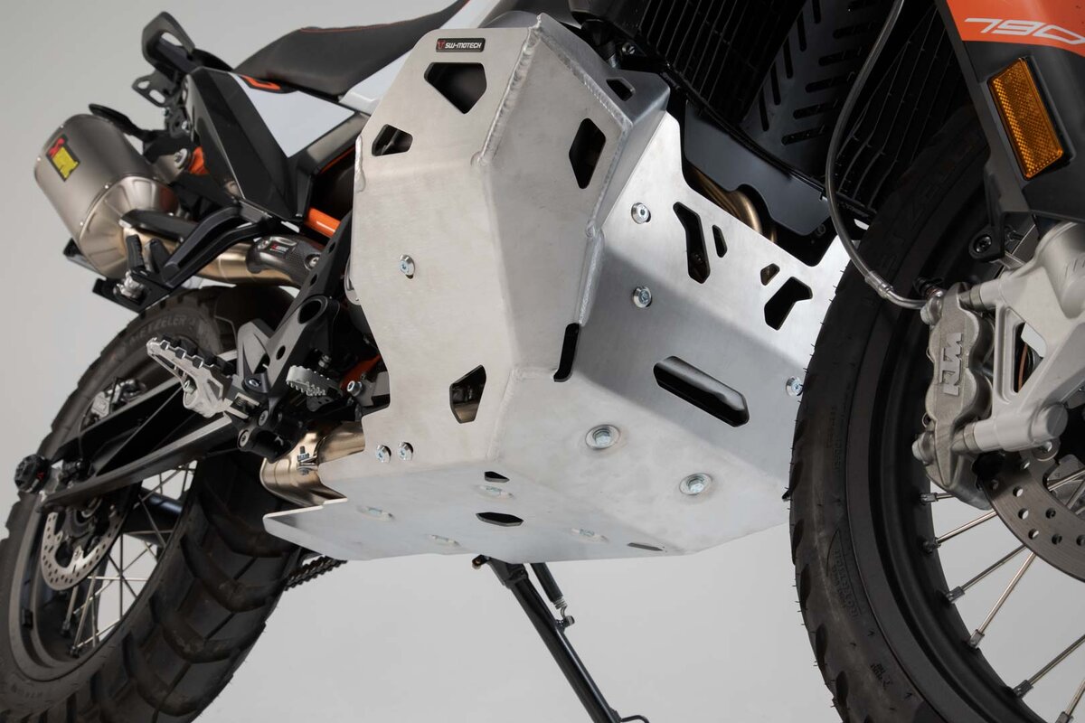 Constructed of 4 mm thick brushed aluminum plate, protecting the underbody of your bike from stone chippng and collision. The whole pattern ensures good ventilation of the engine block. Vibration is reduced by use of rubber mounts. Available in black and silver.