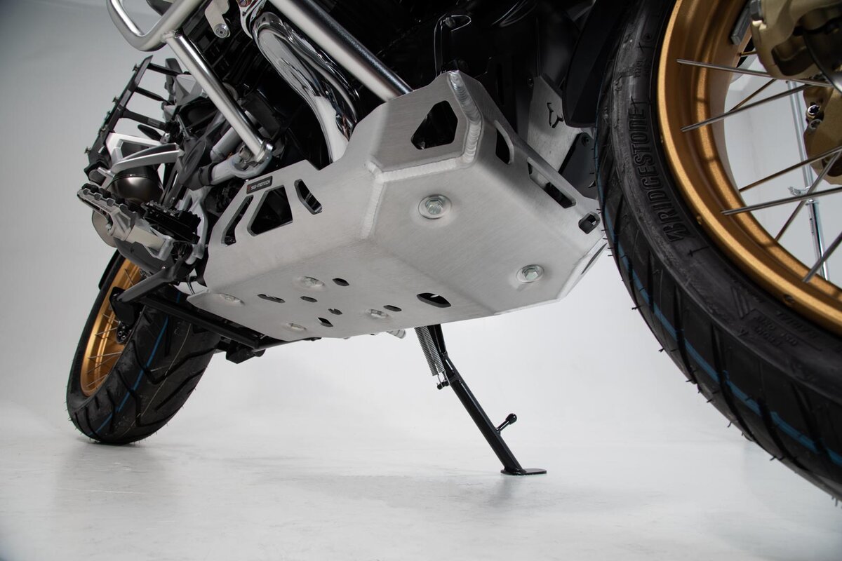 Constructed of 5 mm thick brushed aluminum plate, protecting the underbody of your bike from stone chippng and collision. The whole pattern ensures good ventilation of the engine block. Vibration is reduced by use of rubber mounts. Available in black and silver.
