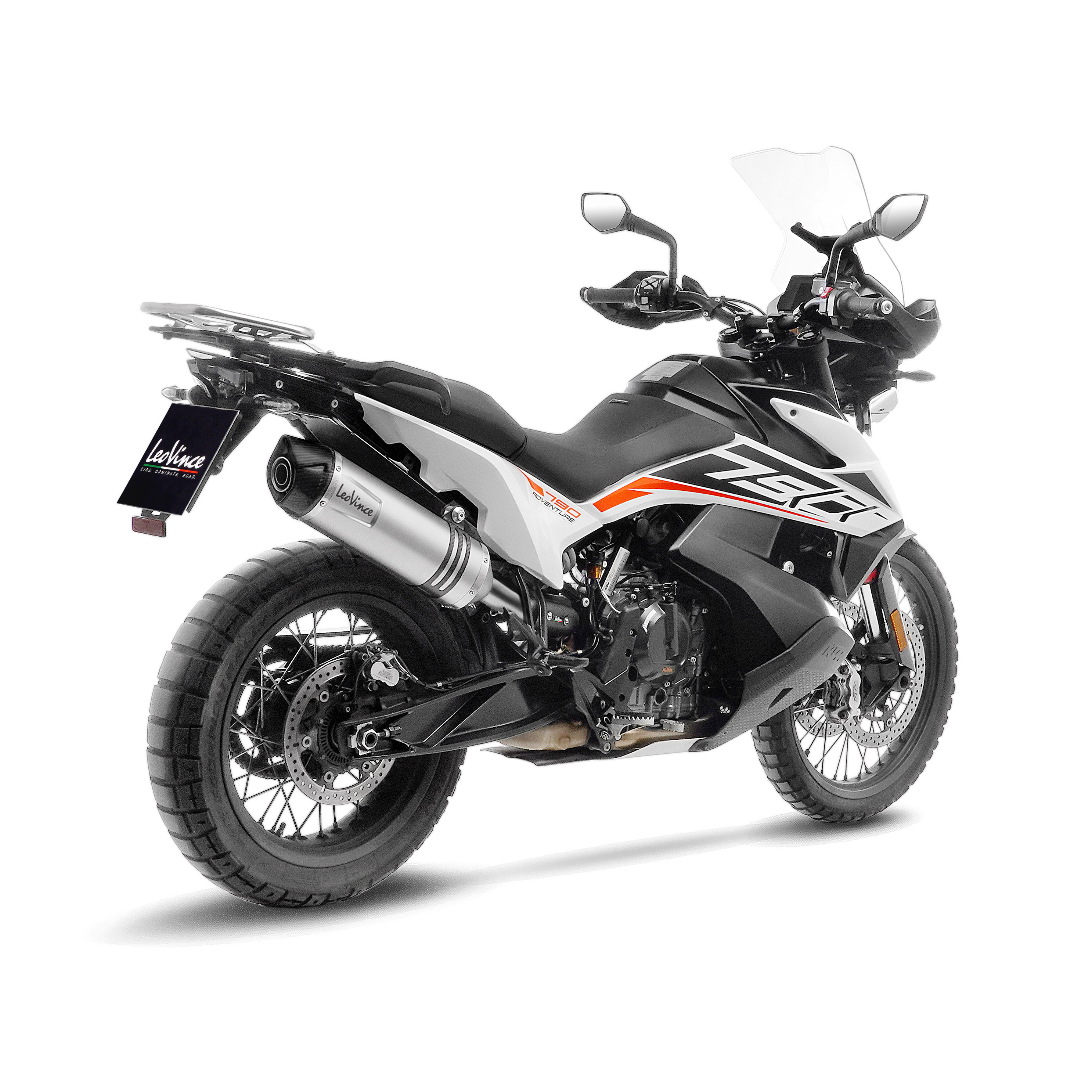 resistance up to 900 degrees.The muffler LV One Evo LeoVince line in stainless steel with carbon fiber cup, allows an increase in power, combined with a unique and unmistakable sound. Designed on the specific lines of yours KTM 890/790 Adventure, maintains original homologation of the bike, with the weight of approx 3.24 Kg, it is -0,41 Kg, much lighter and more performing than the standard exhaust. The terminal does not require remapping and is equipped with everything necessary for a perfect assembly (Fitting, clamps and bolts).