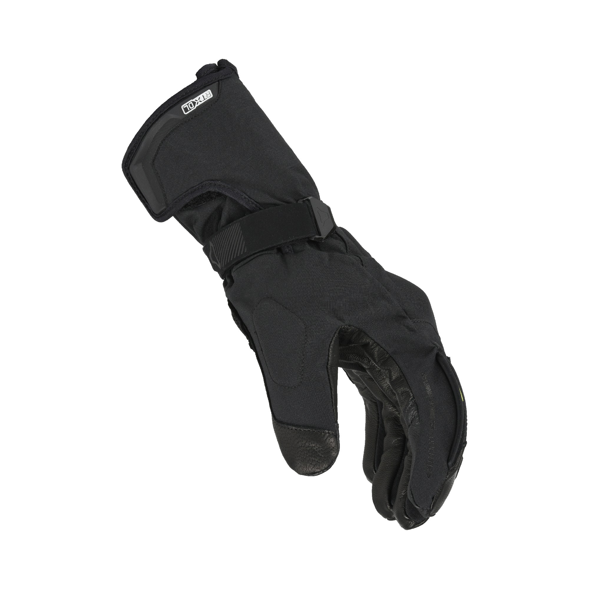 A long-cuffed, directly laminated, and insulated glove with solid protection at the knuckles and a reinforced leather palm, suited for riders in mild/rainy to cold riding conditions.