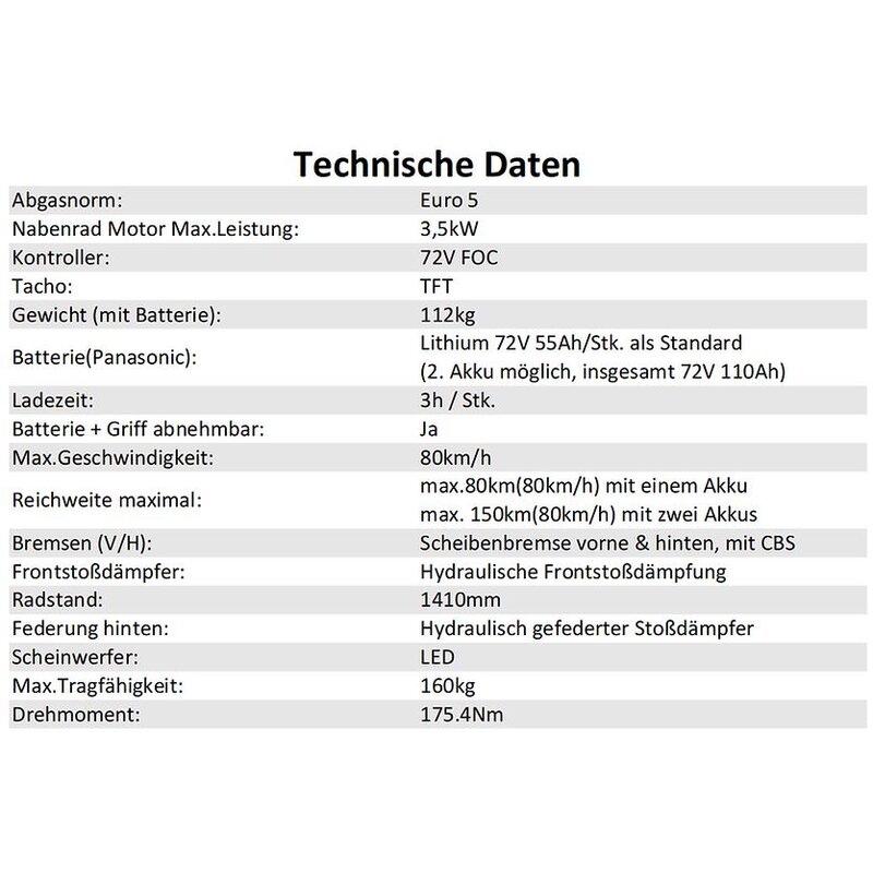Battery cells: Panasonic Charger external: 230V socket Empty weight (kg): 112 Battery weight (kg per battery): unknown Maximum payload (kg): 160 Permissible total weight (kg): unknown Dimensions (LxWxH in mm): unknown Wheelbase (mm): 1410 Seat height (mm): unknown Ground clearance (mm): unknown Number of seats: 2 Brake front axle: hydraulic disc brake Brake rear axle: hydraulic disc brake CBS: yes (no ABS) tires front axle: unknown tires rear axle: unknown Suspension front axle: hydraulic telescopic fork Suspension rear axle: hydraulic shock absorber App control: no USB port: unknown display: TFT lighting technology: LED riding modes: unknown Stand: Main & side stand Vehicle class: L3e Driving license required: yes (min. B196, A1) Key type: unknown Warranty: 2 years Translated with www.DeepL.com/Translator (free version)